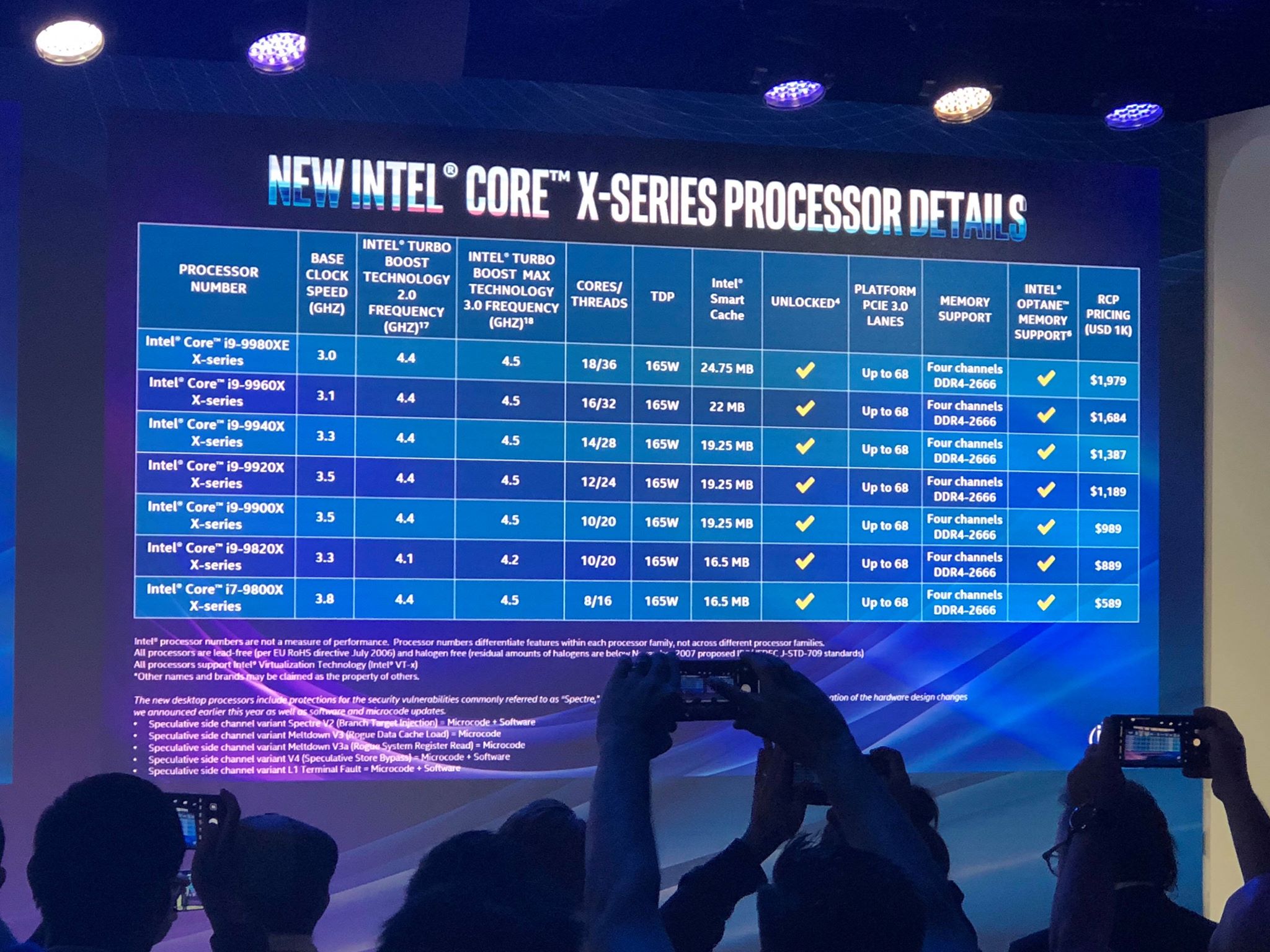 Параллельно с анонсом настольных процессоров Core 9-го поколения Intel также обновила модельный ряд чипов для high-end платформы LGA2066/X299 (Basin Falls). Дебютанты относятся к семейству Skylake-X Refresh и отличаются от предшественников в первую очередь более высокими рабочими частотами. Вместе с этим некоторые модели также могут похвастаться большим объёмом кэша L3 и выросшим числом линий PCI Express 3.0.