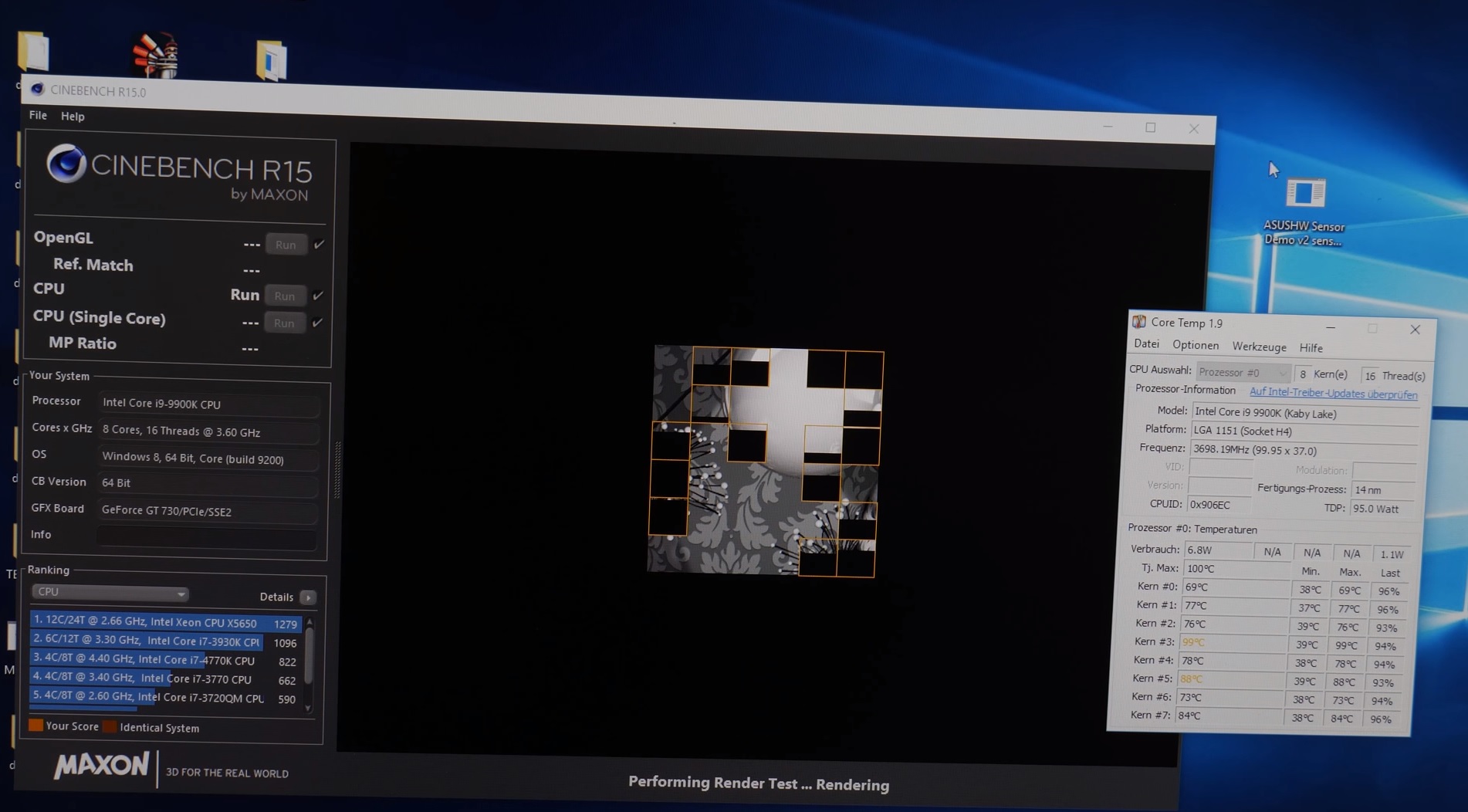 Под крышкой Core i9-9900K, как и обещала Intel, был обнаружен Solder Thermal Interface Material (STIM). Сразу после этого Роман попытался припаять на место теплораспределительную крышку, уменьшив при этом толщину STIM. Данный эксперимент, к сожалению, не увенчался успехом и сразу же после запуска Cinebench R15 температура одного из ядер скакнула к отметке в 100°C.