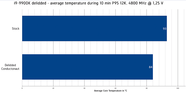 Следующим этапом стала замена штатного термоинтерфейса на жидкий металл Thermal Grizzly Conductonaut. Благодаря этому средняя температура ядер Intel Core i9-9900K, разогнанного до 4,8 ГГц при напряжении 1,25 В, в стресс-тесте Prime95 упала на 8-9°C.