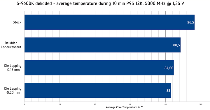 На графике ниже приведены показатели температуры со штатным термоинтерфейсом, жидким металлом, а также со сточенным на 0,15 и 0,2 мм полупроводниковым кристаллом. Подчеркнём, что в последнем случае его толщина всё ещё на 0,25 мм больше, чем у решений прошлого поколения.