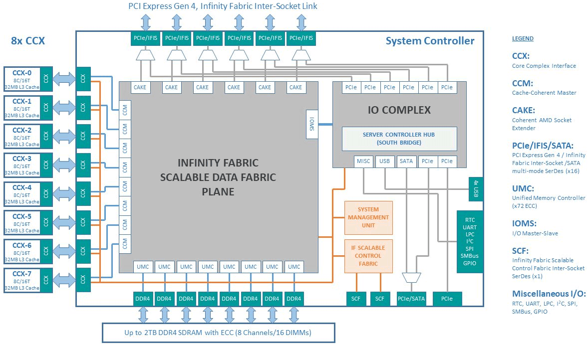 Тем не менее, от выпуска 64-ядерного серверного процессора EPYC компания отказываться не планирует. Под крышкой такого CPU инженеры Advanced Micro Devices намерены разместить сразу девять полупроводниковых чипов: восемь 8-ядерных модулей и так называемый системный контроллер (System Controller), которому отводятся функции набора логики. Благодаря такому подходу удастся снизить задержки шины Infinity Fabric, а также не заботиться о непосредственной связи каждого кристалла с оставшимися семью.