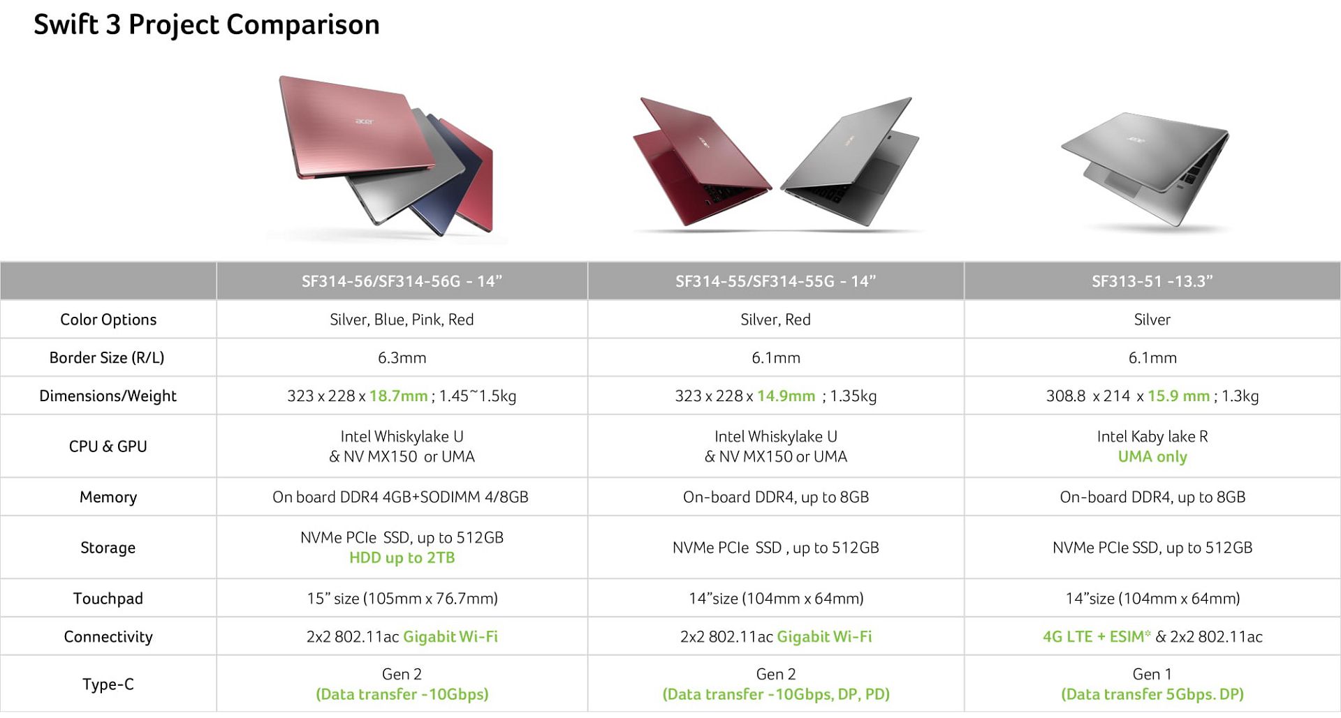 Лэптопы Acer Swift 5 могут похвастаться корпусом из алюминиево-магниевого сплава, используют аппаратную платформу Intel Whiskey Lake-U и весят менее килограмма. Устройства оснащаются 14- или 15,6-дюймовым экраном с тонкими рамками и примечательны небольшой толщиной корпуса (14,9 или 15,9 мм). Время автономной работы составляет 8-10 часов. Цена новых Swift 5 в украинских магазинах составит от 40 тыс. гривен.