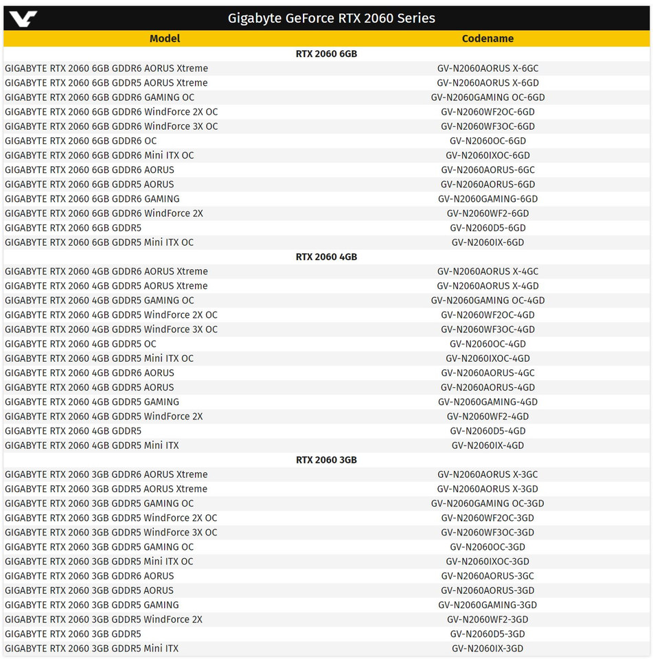 Новинки Gigabyte будут отличаться не только системой охлаждения и заводским разгоном, но также объёмом и типом видеопамяти. Если точнее, то планируется выпустить модификации GeForce RTX 2060 6GB, RTX 2060 4GB и RTX 2060 3GB. Все они могут быть оснащены как «шустрыми» микросхемами памяти GDDR6, так и давно знакомыми GDDR5 (или GDDR5X).