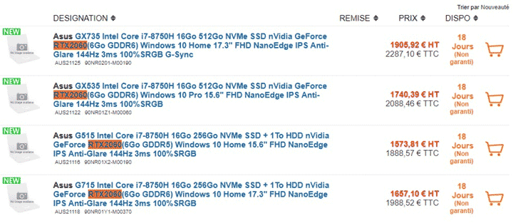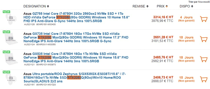 Тем временем французская розничная сеть pc21.fr добавила в свой ассортимент большое количество моделей ноутбуков фирмы ASUS с видеокартами Nvidia RTX 2080, RTX 2070 и RTX 2060. Причем новинки встречаются как в обычном варианте, так и в модификации Max-Q с оптимизированным энергопотреблением.