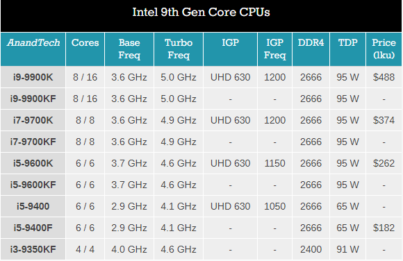 Как и ожидалось, в рамках выставки CES 2019 корпорация Intel представила ряд новых процессоров Coffee Lake-S Refresh. Среди них пять моделей с суффиксами «F» и «KF», свидетельствующими о деактивированном графическом ядре, а также Core i5-9400, пришедший на смену популярному шестиядернику Core i5-8400. Краткие технические характеристики новинок приведены в таблице ниже.