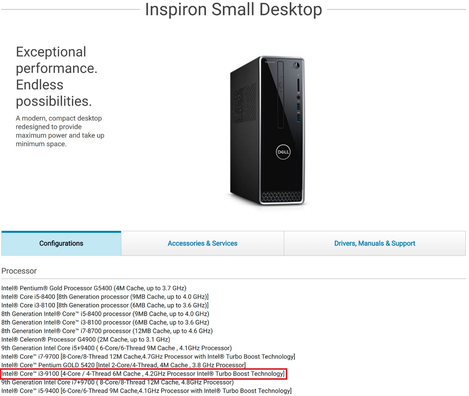 Номинальная частота Intel Core i3-9100 и Core i3-9100F, подобно вышедшему ранее Core i3-8100, составит 3,6 ГГц. Однако, если верить официальному сайту Dell, готовящиеся к выпуску CPU получат поддержку технологии Turbo Boost, благодаря чему они смогут разгоняться вплоть до 4,2 ГГц. Иными словами, новые процессоры Core i3 по техническим параметрам будут ещё меньше отличаться от решений Core i5 поколений Skylake или Kaby Lake.