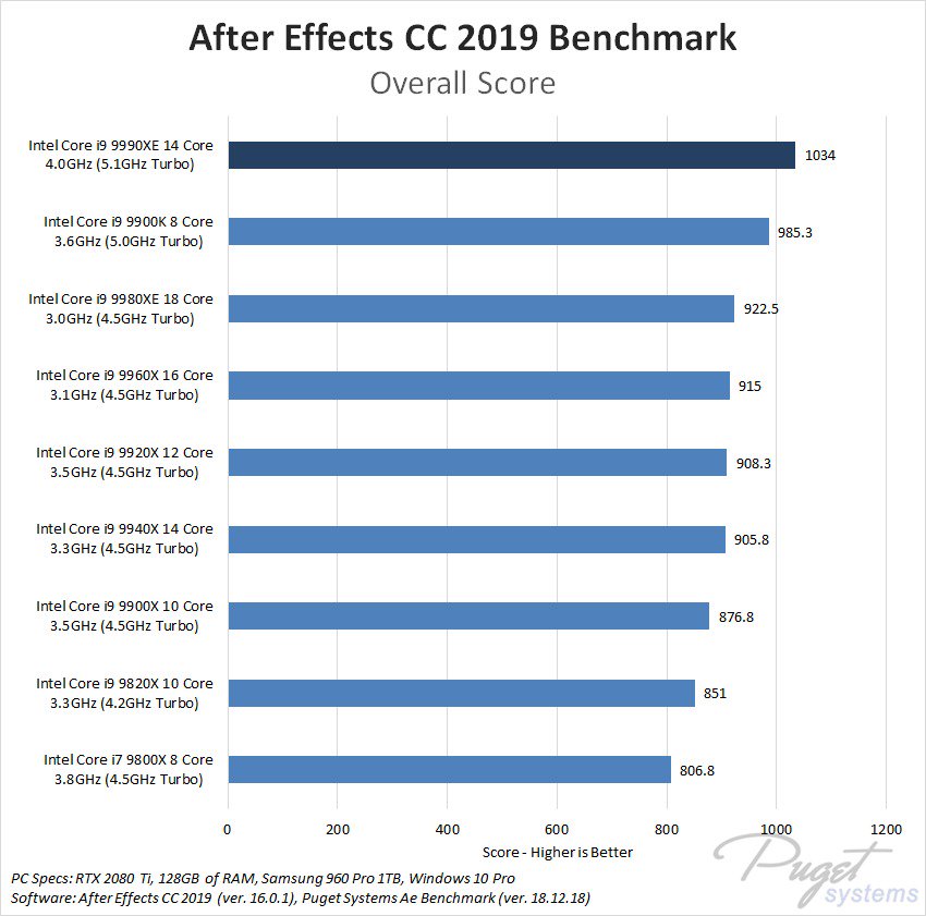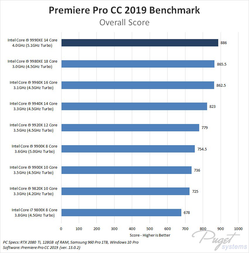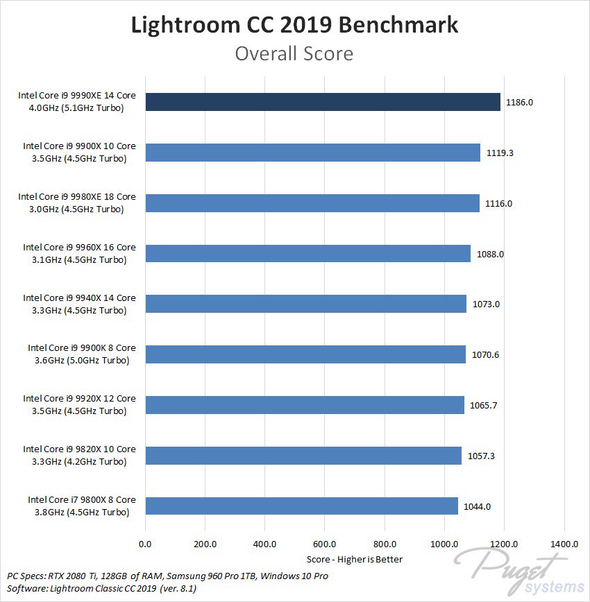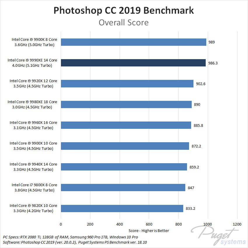 К сожалению, в Puget Systems ограничились сравнением Core i9-9990XE с другими high-end процессорами Intel в программном обеспечении Adobe. Вполне ожидаемо, что высокие рабочие частоты позволили новинке обогнать актуальные чипы для HEDT-платформы LGA2066, правда в тесте Photoshop CC 2019 она немного проигрывает Core i9-9900K (8 ядер/16 потоков, 3,6/5 ГГц).