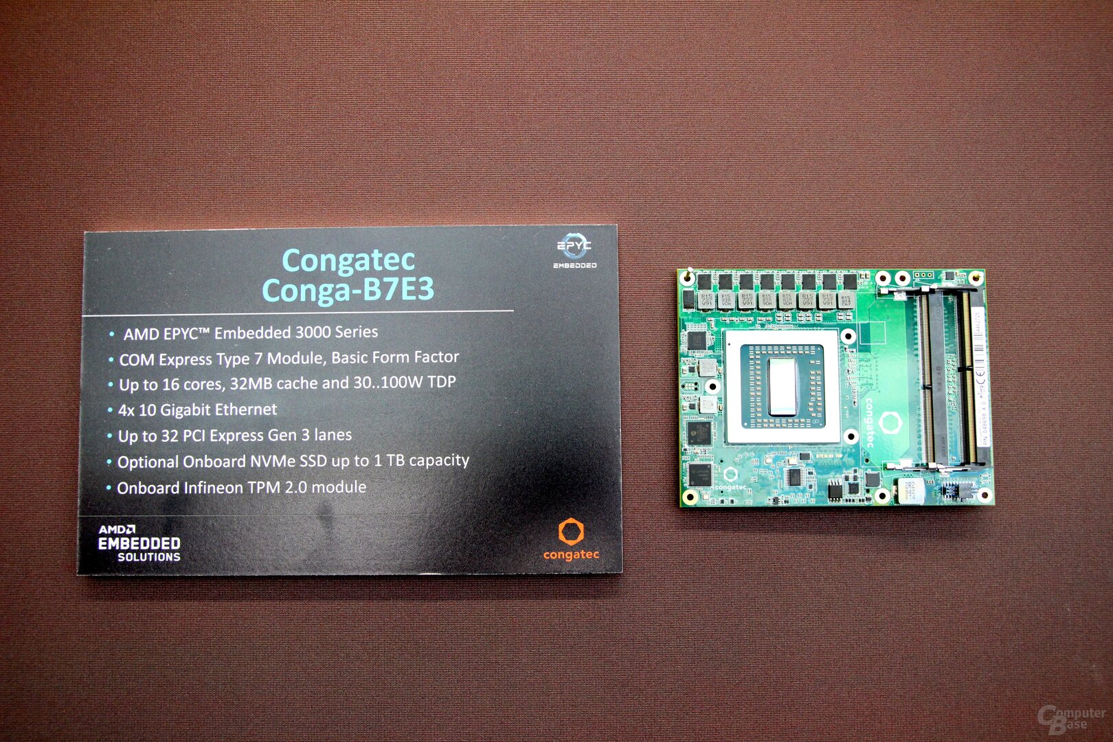 Компания Congatec, крупный ODM-производитель встраиваемых компьютеров, показала новые системы на базе чипов EPYC Embedded 3000. Подобные модули COM Express несут на борту до 16 ядер на архитектуре Zen, поддерживают до 96 Гбайт памяти ECC DDR4-2666, обеспечивают работу четырёх 10-гигабитных сетевых портов и предоставляют 32 линии PCI Express 3.0 для различной периферии.