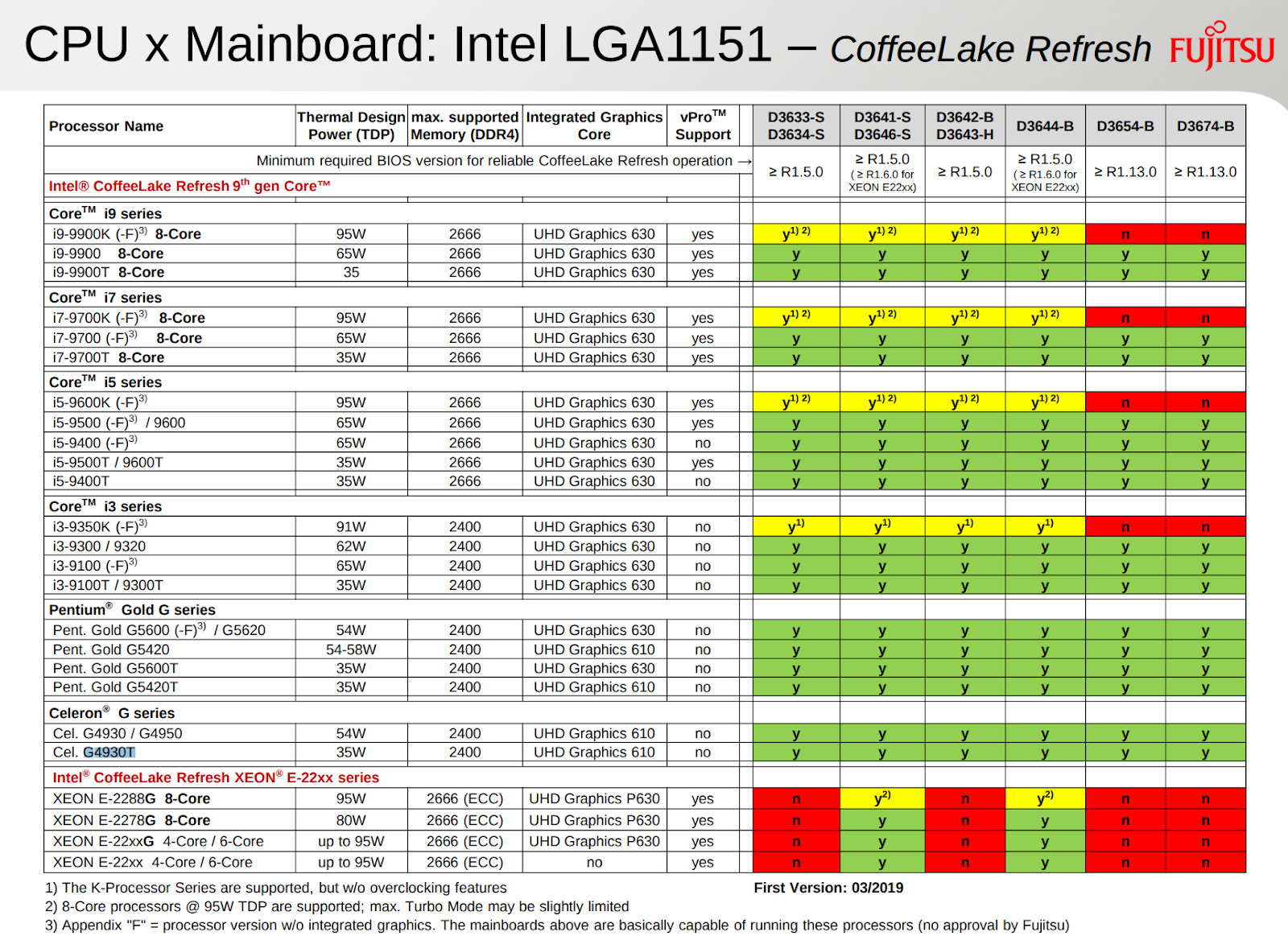 Японский производитель компьютеров Fujitsu ненароком рассекретил полный состав семейства настольных процессоров Intel Coffee Lake-S Refresh (Core 9-го поколения). В обозримом будущем к имеющимся в продаже CPU примкнут 35-ваттные решения с суффиксом «T», а также новые Celeron, Pentium Gold и Xeon E-2200.