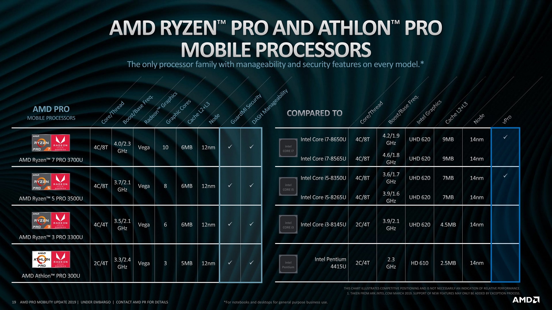 К главным достоинствам гибридных процессоров Ryzen Pro и Athlon Pro компания AMD относит технологию защиты данных GuardMI, трёхлетнюю гарантию, а также доступность APU для OEM-производителей в течение двух лет после релиза. Число ядер Zen+, рабочие частоты, объём кэш-памяти L3 и другие характеристики унаследованы от потребительских решений.