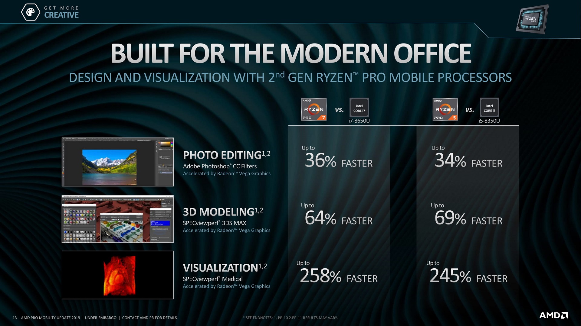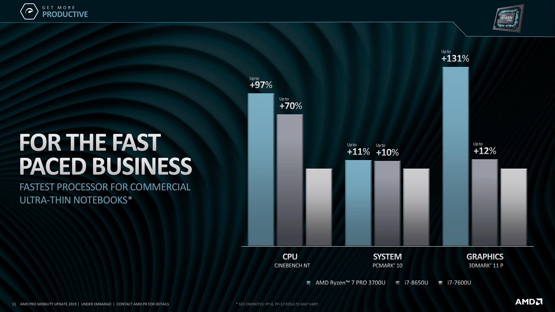 Как считают в AMD, новые Ryzen Pro являются достойными конкурентами мобильных Intel Core 8-го поколения, предлагая сравнимое (или даже лучшее) быстродействие x86-ядер, а также значительно большую производительность графической подсистемы. Время автономной работы лэптопов на базе новых APU, согласно оценкам «красных», достигает 12 часов.