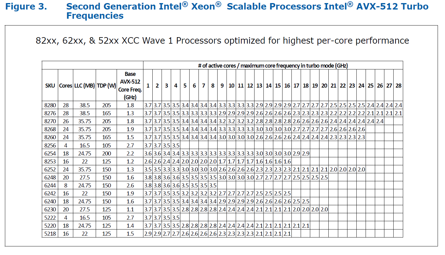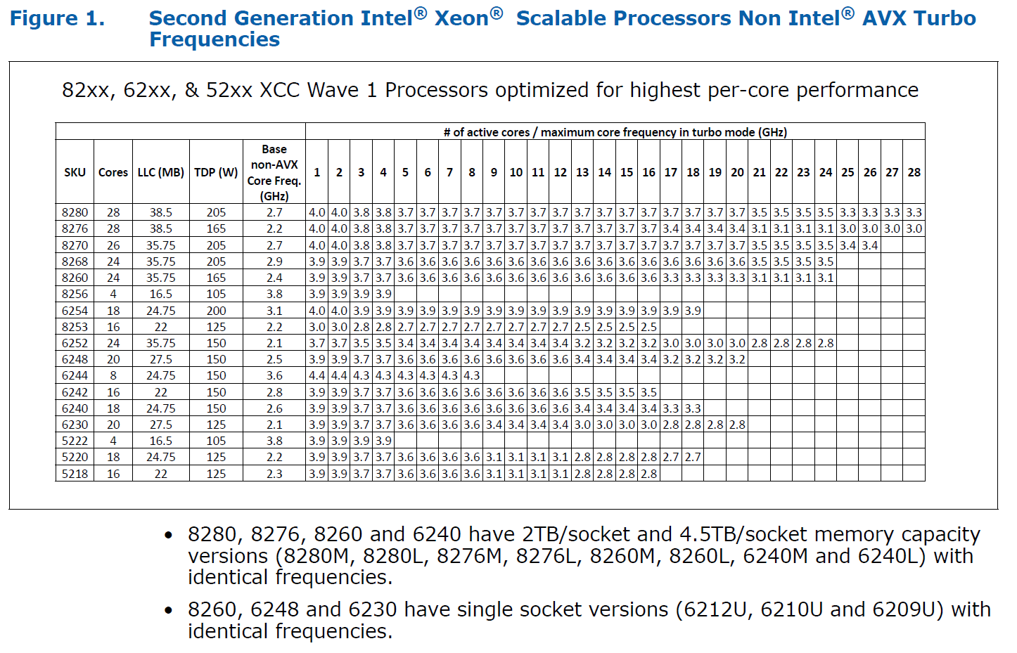 Кроме того, в Сети появился документ, рассказывающий о частотах Turbo Boost серверных Cascade Lake в зависимости от числа используемых ядер и характера нагрузки. Например, у Intel Xeon Platinum 8280 на максимальной скорости в 4 ГГц может работать только два ядра, а если задействовать все 28, то частота CPU опустится до 3,3 ГГц. Впрочем, даже это значение заметно выше его номинальной скорости, равной 2,7 ГГц.