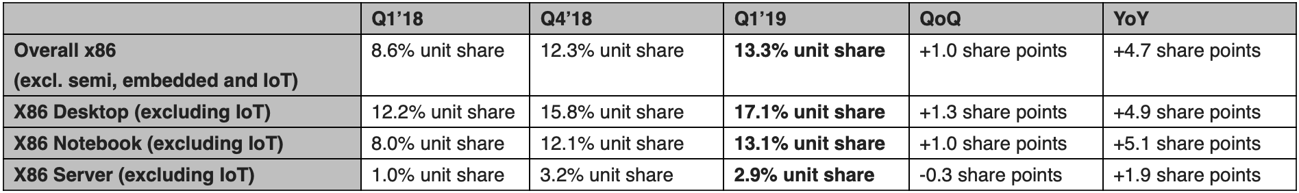 Лучше всего «красный» чипмейкер ощущает себя в настольном сегменте. Привлекательное соотношение цены и быстродействия процессоров Ryzen способствовало увеличению доли AMD до 17,1%, тогда как щё год назад этот показатель был равен 12,2%. В ближайшее время компания планирует выпустить 7-нм решения линейки Ryzen 3000 (Zen 2), что должно помочь ей улучшить недавние успехи.