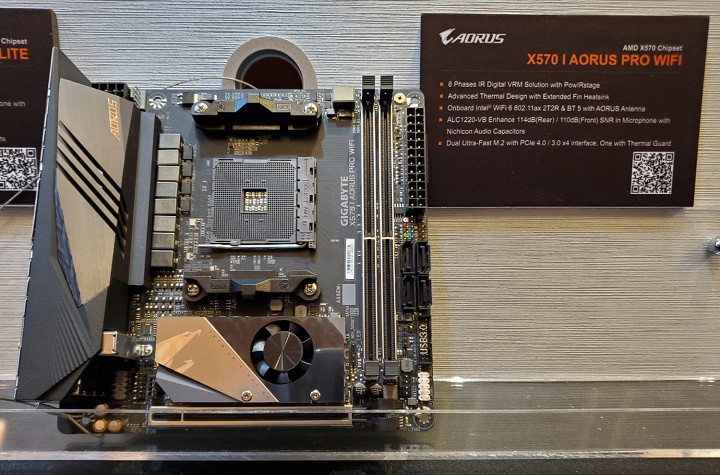 Ещё одной интересной новинкой Gigabyte Technology является плата X570 I Aorus Pro WiFi, выполненная в формате Mini-ITX. Она получила 8-фазную систему питания разъёма AM4, беспроводной модуль WI-Fi 6, два разъёма M.2 и четыре порта SATA 6 Гби/с. Как и в случае подавляющего большинства плат с логикой AMD X570, активное охлаждение чипсета обеспечивает небольшой радиатор.