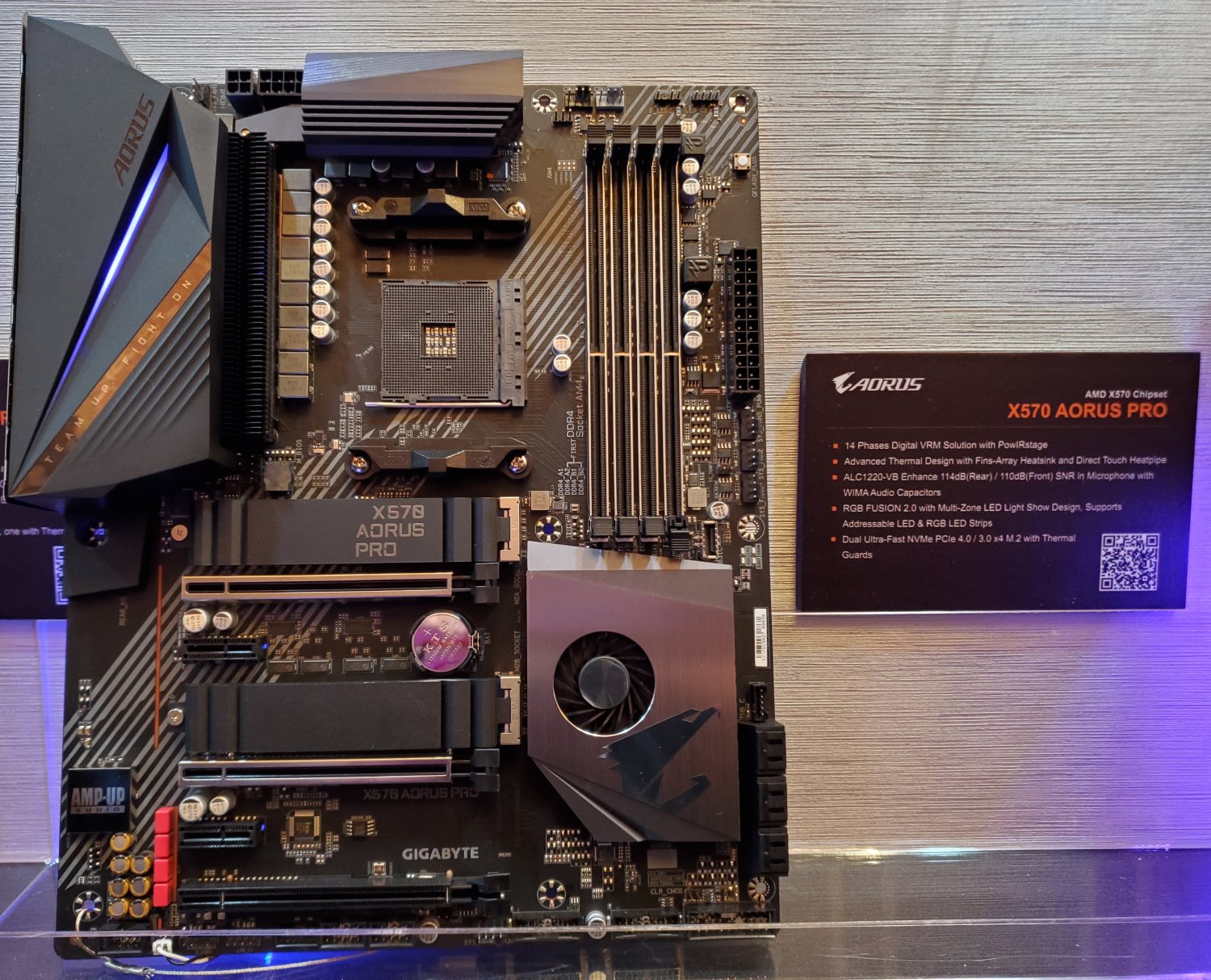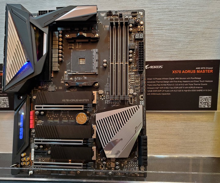 Новинка обещает стать одним из наиболее «продвинутых» решений для центральных процессоров Ryzen 3000. Инженеры Gigabyte разместили на PCB формата E-ATX три PCI Express 4.0 x16, четыре слота под оперативную память DDR4-3200 (максимальный объём 128 ГБ), три разъёма M.2, индикатор POST-кодов, площадки для измерения напряжений и многое другое.