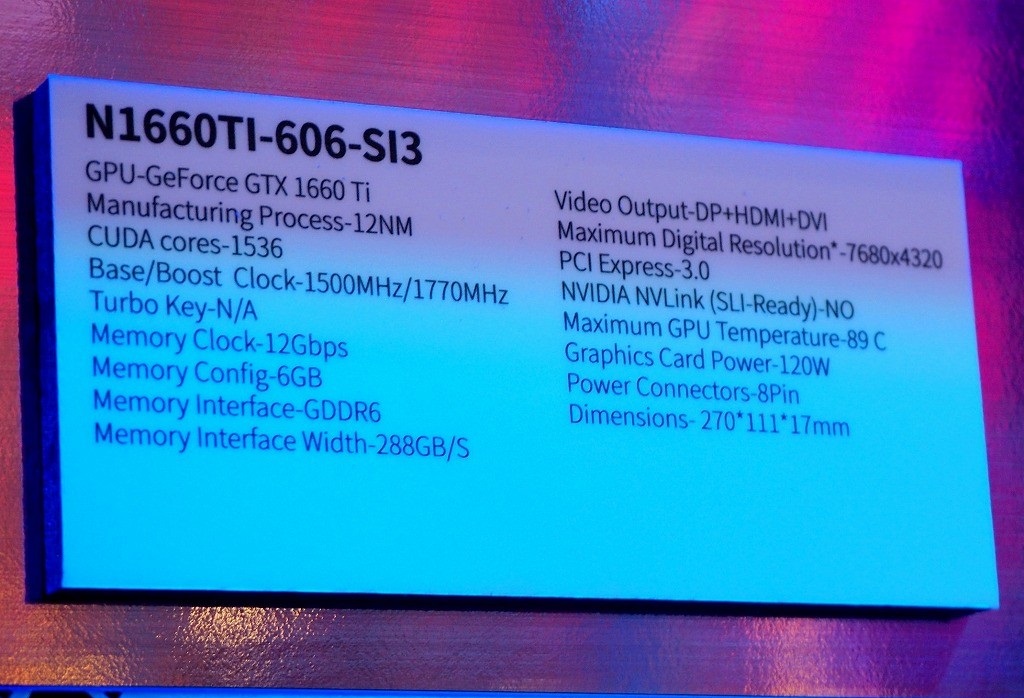 Графический процессор Nvidia TU116 работает с эталонными частотами 1500/1770 МГц. Эффективная частота 6 Гбайт памяти GDDR6 равна 12 ГГц, что обеспечивает пропускную способность на уровне 288 Гбайт/с.