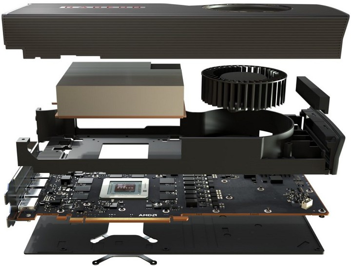 Энергопотребление устройства находится на уровне 225 Вт, а для подключения дополнительного источника питания доступны 6- и 8-конткактные разъёмы. В эталонном исполнении карта оснащена двухслотовой системой охлаждения с центробежным вентилятором, а в основании радиатора имеется испарительная камера. На задней панели доступны порты HDMI 2.0b и DispayPort 1.4 (x3).