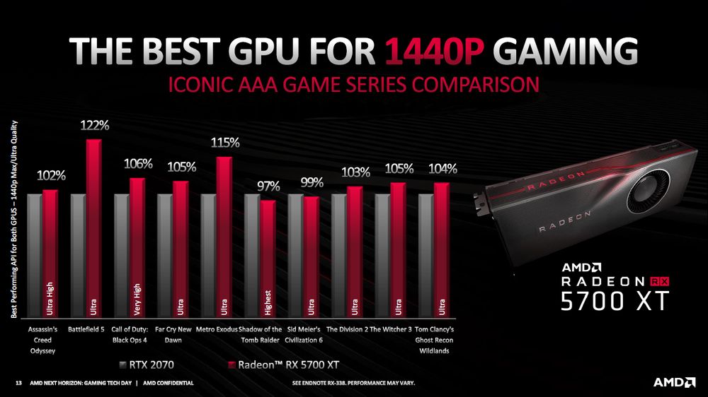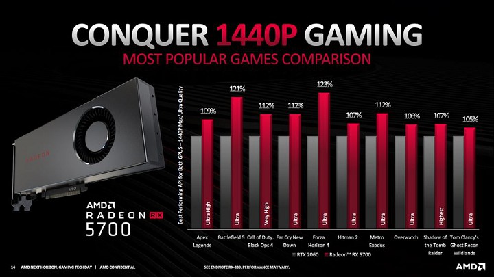 Согласно собственным тестам AMD, адаптер Radeon RX 5700 XT обеспечивает примерно на 5% лучшую производительность в играх, нежели Nvidia GeForce RTX 2070, а также превосходит Radeon RX Vega 56 на 24-41% в зависимости от проекта. Младшая Radeon RX 5700 станет конкурентом GeForce RTX 2060, предложив на 5-23% лучшее быстродействие.