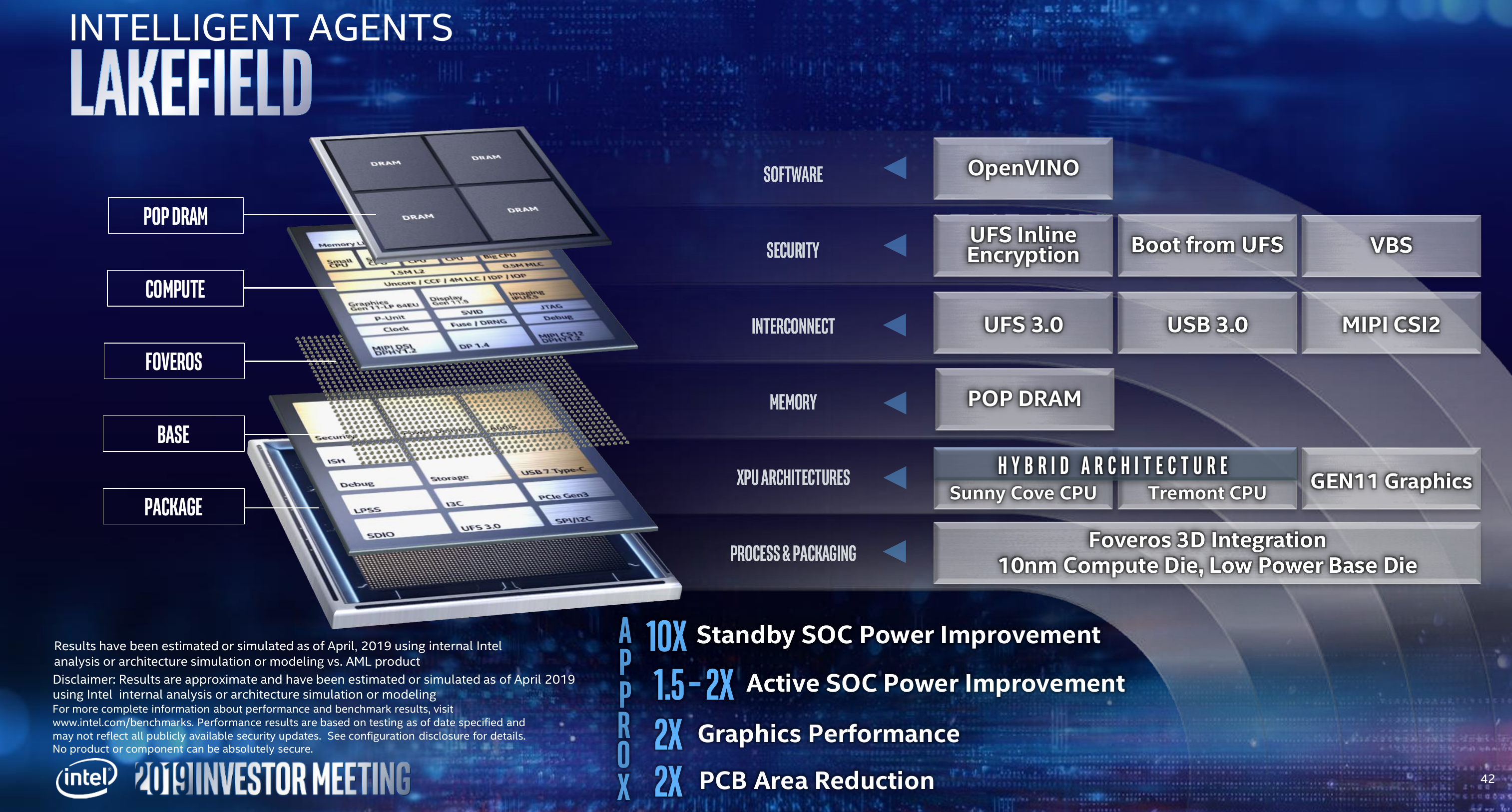 До конца года корпорация Intel планирует наладить выпуск однокристальных систем Lakefield, созданных в рамках трёхмерной концепции Foveros. В SoC размером 12 x 12 x 1 мм чипмейкер объединил несколько кристаллов, содержащих 22-нм системную логику, четыре 10-нм маломощных ядра на архитектуре Tremont, одно ядро Sunny Cove, графический модуль Gen11 с 64 исполнительными блоками и 8 Гбайт системной памяти LPDDR4X-4267. И всё это при номинальном TDP не более 7 Вт.