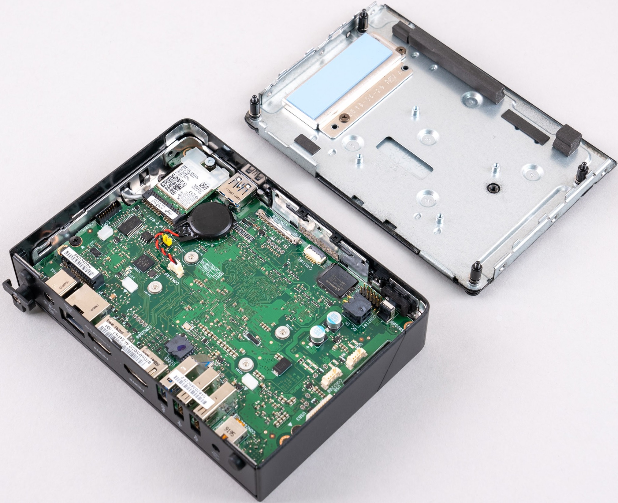 Компьютер Intel NUC8CHK выполнен в корпусе с габаритами 154 x 108 x 32 мм. На материнской плате размером 146 x 102 мм распаяны четыре гигабайта памяти LPDDR3-1866, накопитель eMMC объёмом 64 ГБ, разъём M.2 для SSD с интерфейсом SATA 6 Гбит/с или PCI Express 2.0 x4 и ещё один M.2, занятый беспроводным модулем Intel Wireless-AC 3168 (Wi-Fi 802.11ac и Bluetooth 4.2).