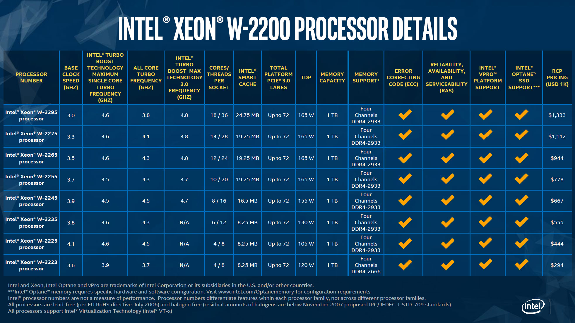В процессорное семейство Intel Xeon W-2200 вошли CPU с числом ядер от 4 до 18. Все они поддерживают Hyper-Threading, работают с памятью DDR4 в четырёхканальном режиме, содержат контроллер PCI-Express 3.0 на 48 линий и характеризуются номинальным TDP от 120 до 165 Вт.