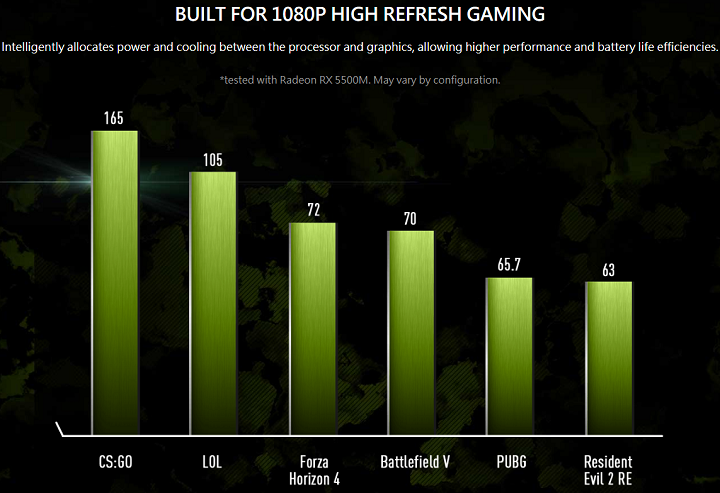 Напомним, мобильная версия Radeon RX 5500 4GB оперирует тем же числом потоковых процессоров RDNA (1408 единиц), что и десктопный аналог, но при этом довольствуется более скромными частотами GPU — до 1448/1645 МГц (Game/Boost Clock) против 1717/1845 МГц. Впрочем, даже при этом она способна выдать более 60 fps во многих ААА-проектах со средневысокими настройками качества графики.
