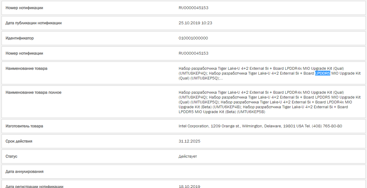 В базе данных Евразийской экономической комиссии (ЕЭК) обнаружилась запись, посвященная будущим мобильным процессорам Intel Tiger Lake-U. В ней перечислены несколько комплектов разработчика на базе чипов Tiger Lake-U. Что примечательно, два комплекта оснащаются хорошо знакомой памятью LPDDR4X, а вот остальные два набора получили энергоэффективную память LPDDR5.