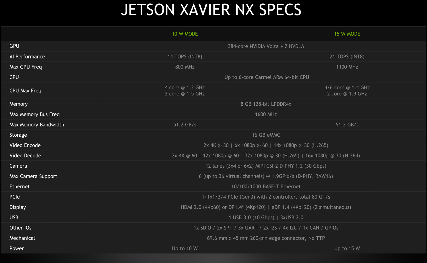 На плате распаян 16-гигабайтный накопитель eMMC и 8 Гбайт оперативной памяти LPDDR4X с пропускной способностью 51,2 ГБ/с. Энергопотребление модуля Jetson Xavier NX может быть равно 10 или 15 Вт. Во втором случае однокристальная система будет работать на повышенных частотах. Детальные характеристики новинки приведены ниже.