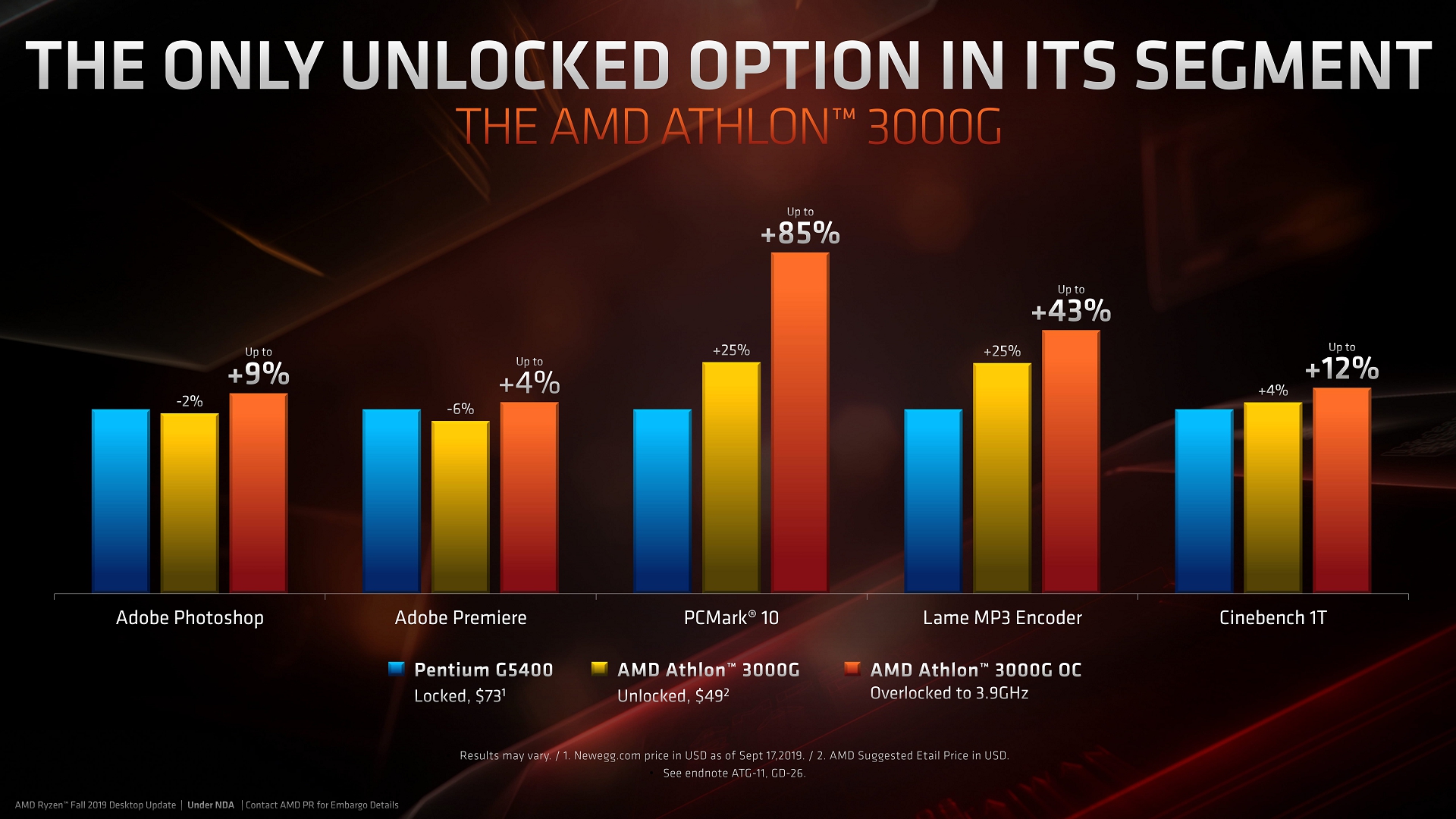 Новый APU составит конкуренцию процессорам Intel Pentium Gold, например, Pentium Gold G5400 (2 ядра/4 потока, 3,7 ГГц) для платформы LGA1151-v2. В собственных тестах AMD гибридный чип Athlon 3000G показал достойное быстродействие, имея при этом меньшую рекомендованную стоимость, нежели ближайший соперник. На прилавки AMD Athlon 3000G поступит 19 ноября с ценой от 49 долларов.