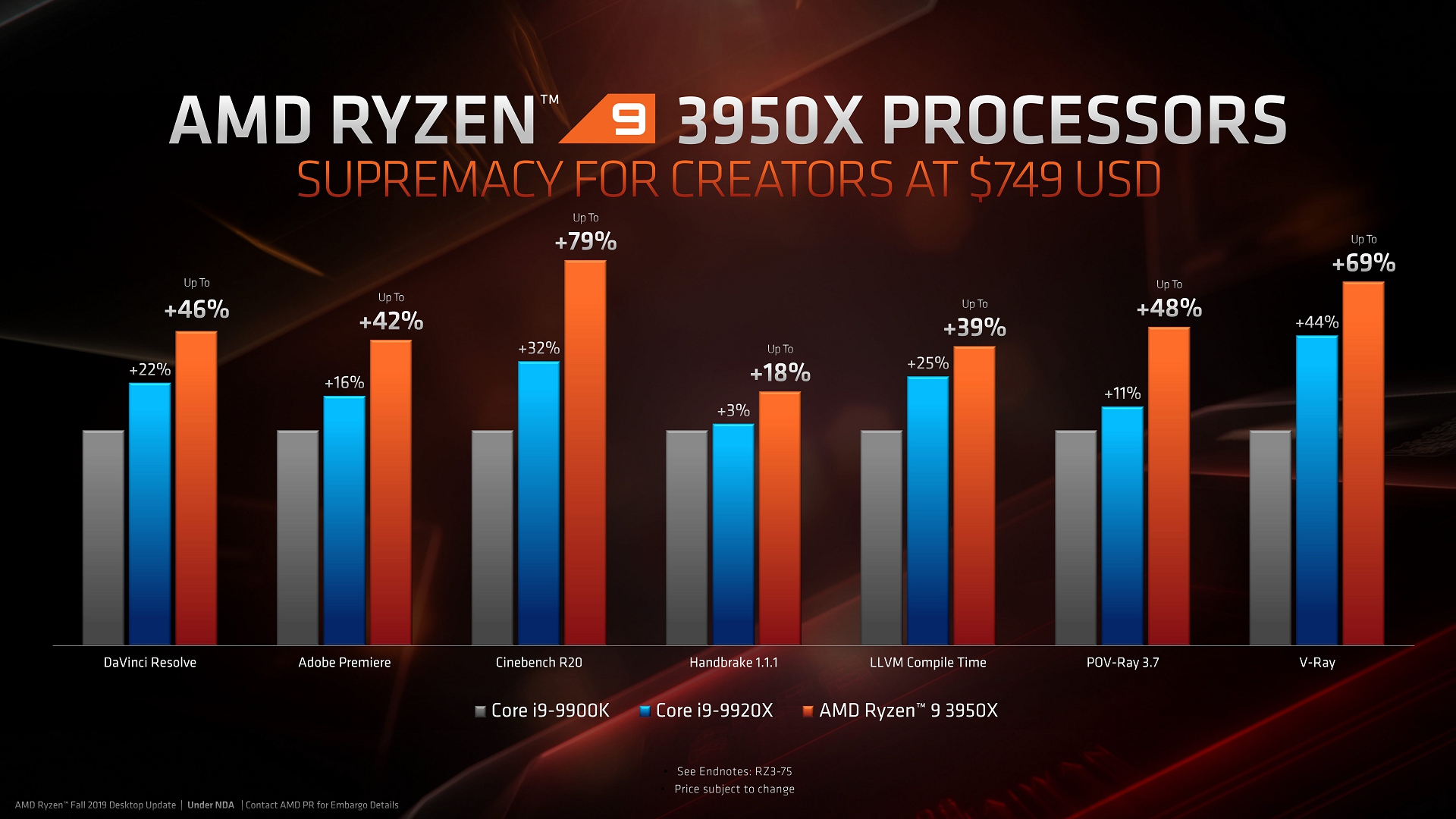 Он позиционируется AMD в качестве промежуточного решения между массовым и HEDT-сегментом. На предоставленных слайдах «красные» сравнивают его не только с Intel Core i9-9900K (8 ядер/16 потоков, 3,6/5,0 ГГц) для массовой LGA1151-v2, но и с Core i9-9920X (12 ядер/24 потока, 3,5/4,4 ГГц) для платформы LGA2066.