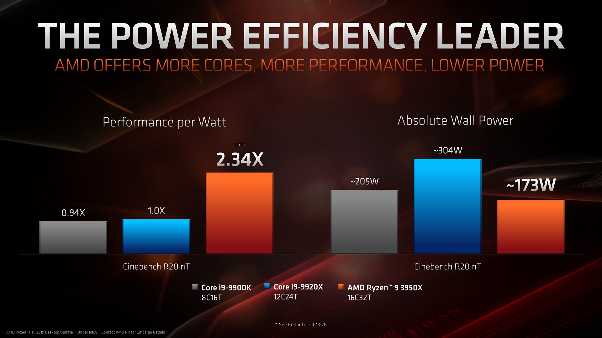 Если верить собственным тестам AMD, Ryzen 9 3950X более чем в два раза превосходит вышеупомянутые CPU Intel по соотношению производительности на ватт. С другой стороны, компания всё же рекомендует использовать для охлаждения флагманского «камня» необслуживаемую СЖО с радиатором типоразмера 280 мм и более.