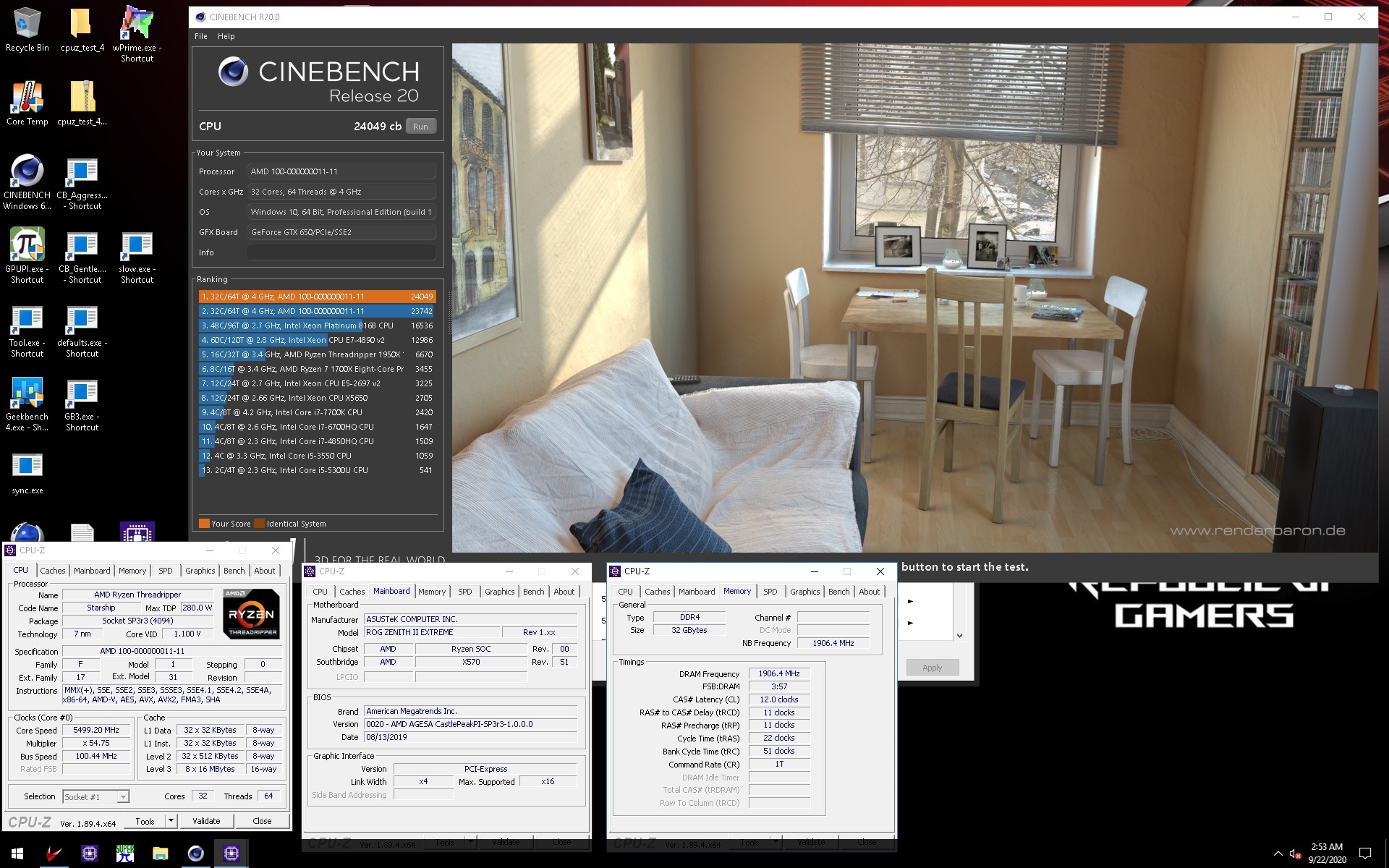 В синтетических бенчмарках, оценивающих грубую вычислительную мощность CPU, нынешний флагман HEDT-платформы AMD Socket sTRX4 не оставил каких-либо шансов изделиям конкурента. К примеру, в небезызвестном Cinebench R15 разогнанный до ~5,5 ГГц под жидким азотом Ryzen Threadripper 3970X набрал 10 672 очка, а Cinebench R20 он завершил с 24 049 баллами.