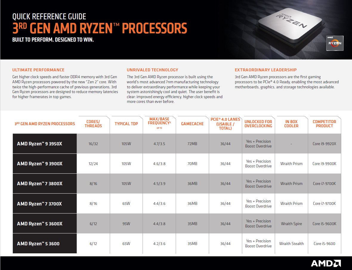 Компания AMD опубликовала серию слайдов, в которых показано позиционирование всех процессоров Ryzen третьего поколения, включая 64-ядерный флагман Ryzen Threadripper 3990X.