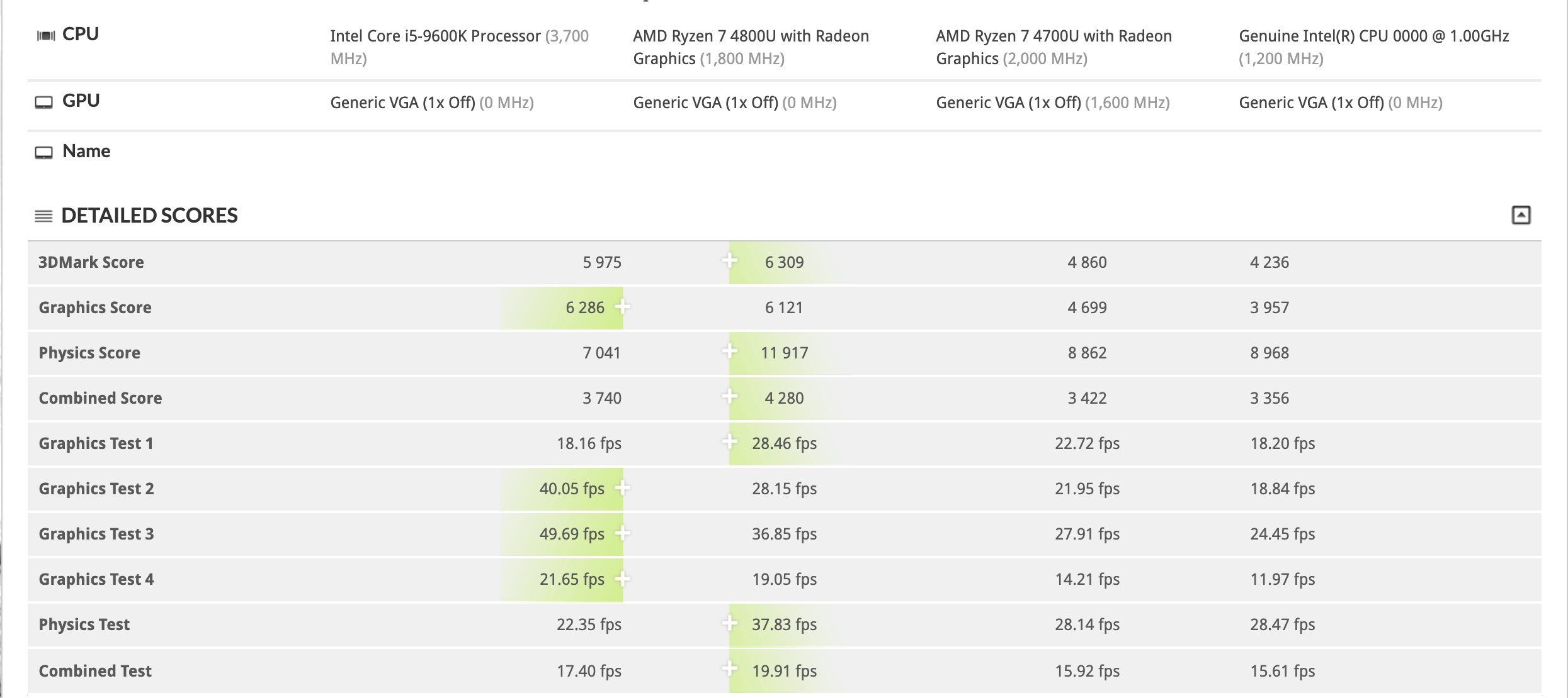 Между тем, в 3DMark удалось сравнить Intel Discrete Graphics 1 не только с родственным iGPU, но и с видеоядрами Radeon Vega в составе 7-нм гибридных чипов AMD Ryzen 7 4700U и 4800U. Здесь победителем стал дискретный адаптер DG1, набравший 6286 «попугаев» Graphics Score. На ступеньку ниже расположился встроенный GPU Radeon Vega 8 с результатом в 6121 балл, а интегрированная графика Intel следующего поколения проиграла Radeon Vega 7: 3957 против 4699 очков Graphics Score.
