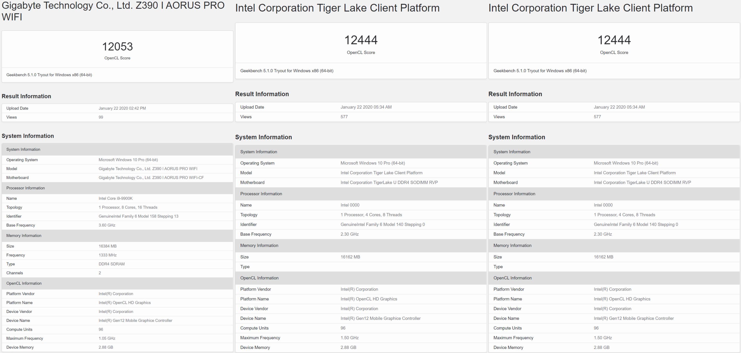 В тесте OpenCL из пакета Geekbench 5 дискретный видеоадаптер Intel DG1 набирает около 12-12,5 тысяч баллов. Для сравнения, похожий результат демонстрируют графические карты GeForce GTX 750 Ti (12,5 тыс. очков), Radeon RX 550 (12,3 тыс.) и GeForce GTX 480 (12,3 тыс.).