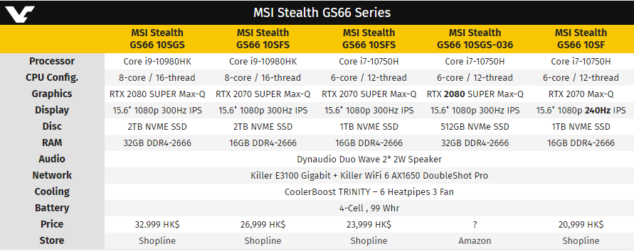 Система охлаждения устройства включает три центробежных вентилятора и семь тепловых трубок. Габариты лэптопа составляют 358,3 x 248 x 19,8 мм, масса — около 2,1 кг. Все известные конфигурации MSI Stealth GS66 приведены в таблице.