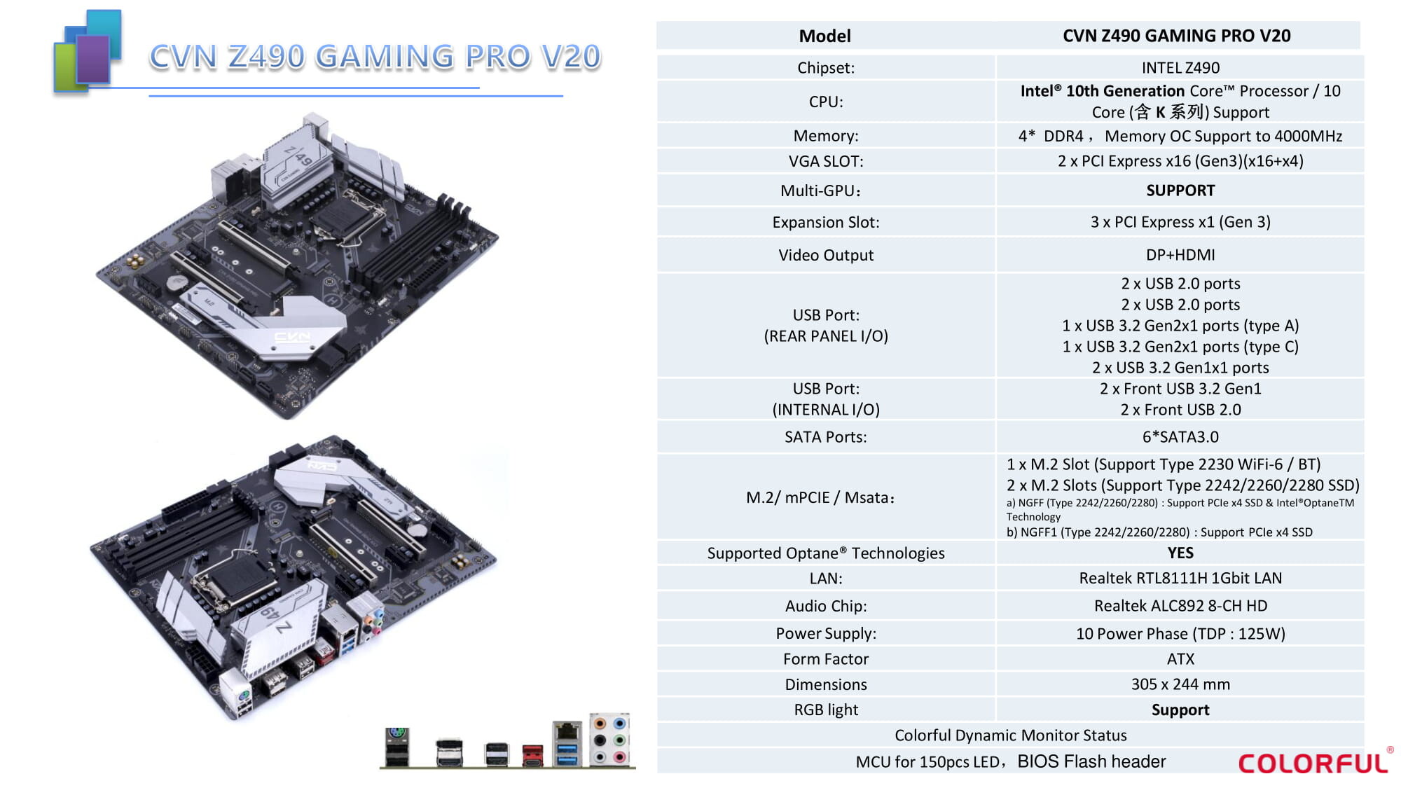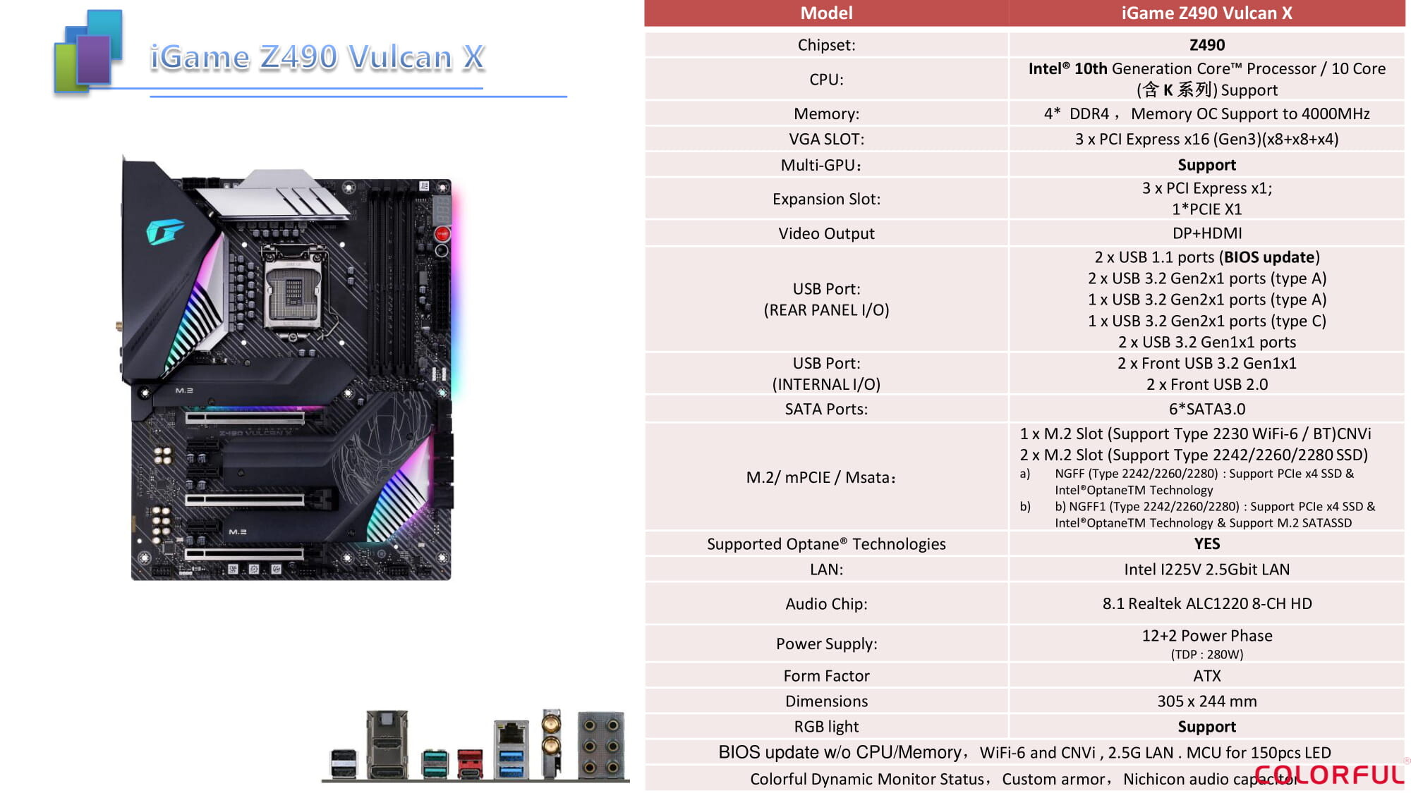 Colorful Technology допустила утечку характеристик материнских плат iGame Z490 Vulcan X и CVN Z490 Gaming Pro V20 для процессоров Intel Core 10-го поколения. Обе новинки используют топовый набор логики Z490 с поддержкой оверклокинга и будут официально представлены в этот четверг, 30 апреля.