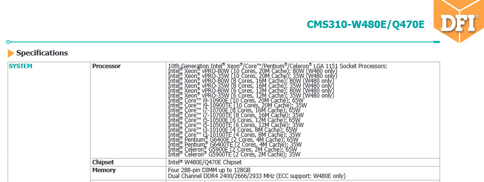 DFI работает над готовыми ПК с материнскими платами CMS310-W480 и CMS310-Q470, о которых мы рассказывали ещё зимой. В их основе, как нетрудно догадаться, лежат наборы системной логики Intel W480 и Q470. Ключевой особенностью платы CMS310-W480 станет поддержка процессоров Xeon и ECC-памяти. DFI не уточняет конкретные модели чипов Intel Xeon, однако их ассортимент будет представлен 6-, 8- и 10-ядерными решениями.