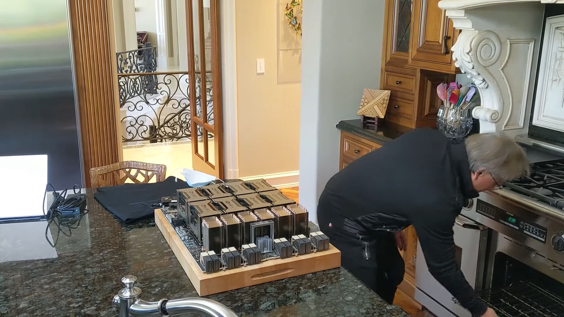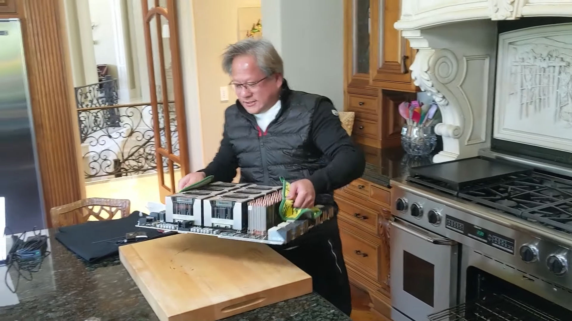 На нём глава Nvidia достал из духовки плату внушительных размеров, которую он именует «самой большой в мире графической картой». Глядя на систему охлаждения и компоновку платы можно с уверенностью сказать, что перед нами преемник суперкомпьютера DGX-2. Под восемью идентичными радиаторами спрятаны графические ускорители следующего поколения, а ещё шесть охладителей, вероятно, прикрывают чипы-коммутаторы NWSwitch.