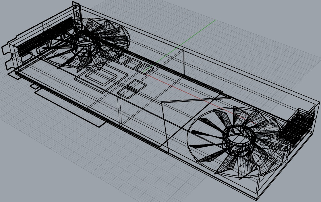 Внешние грани кожуха выполнены в серебристом цвете. Голубой оттенок объясняется ещё не снятой защитной плёнкой. Разъёмы дополнительного питания, вероятно, расположены в задней части, как у профессиональных 3D-ускорителей Nvidia Quadro. Правда, в этом случае не обошлось без дополнительных кабелей, соединяющих разъёмы с укороченной печатной платой.