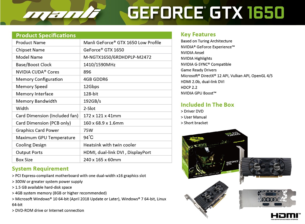 Гонконгская фирма Manli Technology Group анонсировала релиз видеокарты GeForce GTX 1650 Low Profile. Видеоадаптер, как подсказывает название, выполнен в формате низкопрофильной карты расширения, но вместе с этим занимает пространство двух слотов. Ещё одной отличительной чертой новинки стало применение микросхем GDDR6.