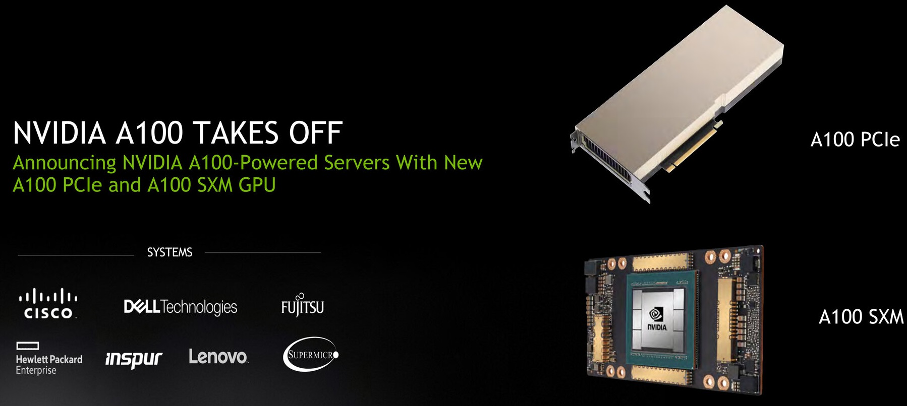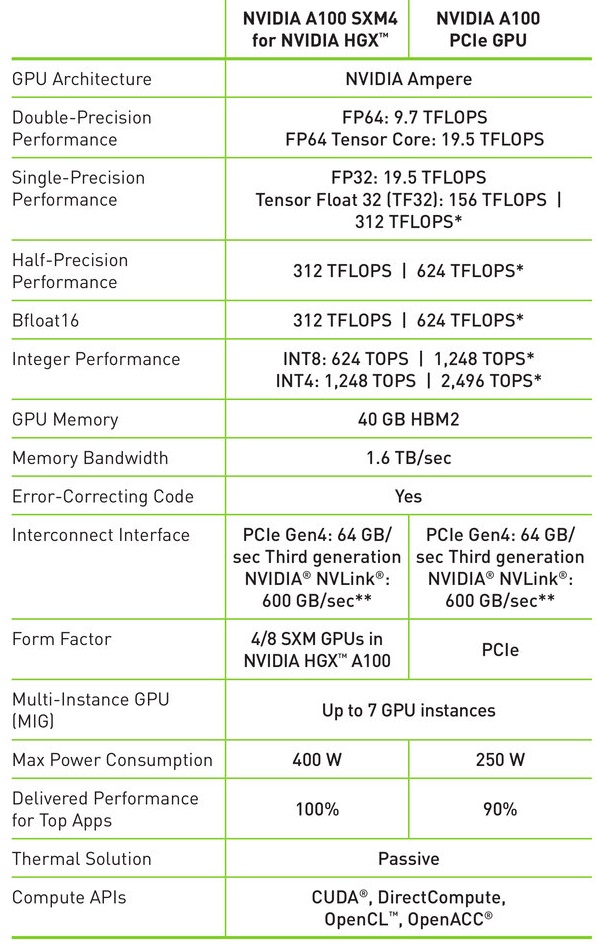 Корпорация Nvidia подготовила альтернативную модификацию ускорителя A100 в формате карты расширения PCI Express 4.0 x16. Модель не уступает в пиковой производительности варианту SXM4 со скоростным интерфейсом NVLink 3.0, но при этом характеризуется 250-ваттным TDP, тогда как у выпущенной ранее версии он составляет 400 Вт.