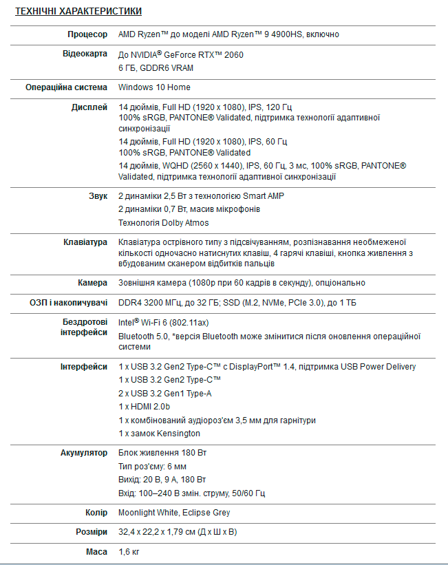 В Украине уже доступна конфигурация Zephyrus G14 (GA401II-BM179T) с процессором AMD Ryzen 7 4800HS, видеокартой Nvidia GeForce GTX 1650 Ti, ОЗУ 8 ГБ, SSD на 512 ГБ и матричным дисплеем AniMe Matrix, выполненная в белом цвете. Ее цена составляет 41 200 гривен. Другие конфигурации ноутбука ожидаются в ближайшем времени по цене от 31 100 гривен.