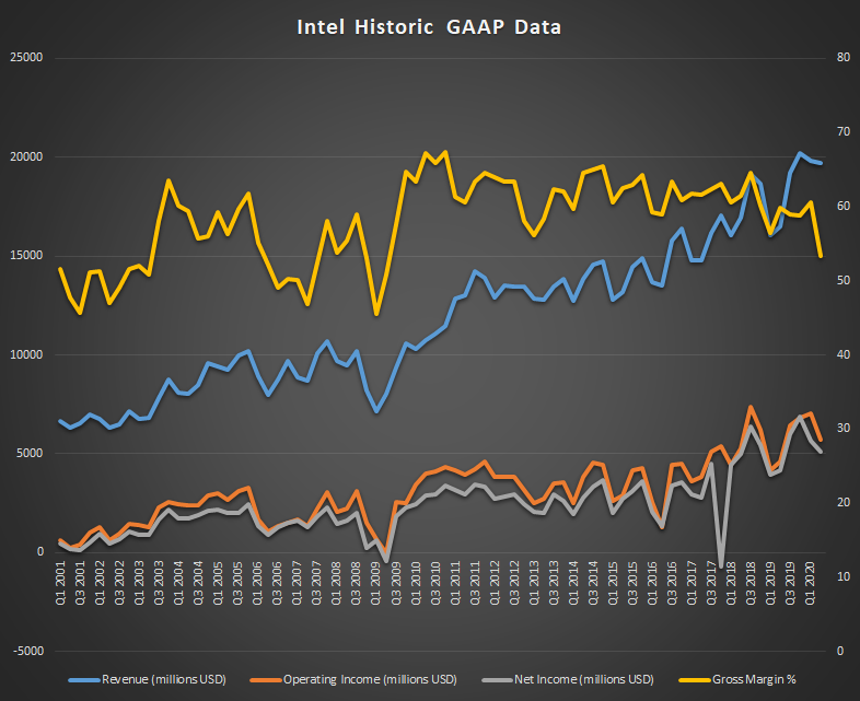Выручка Intel (млн долл., синяя кривая), валовая рентабельность (%, жёлтая кривая), операционная прибыль (млн долл., оранжевая кривая) и чистая прибыль (млн долл., серая кривая)
