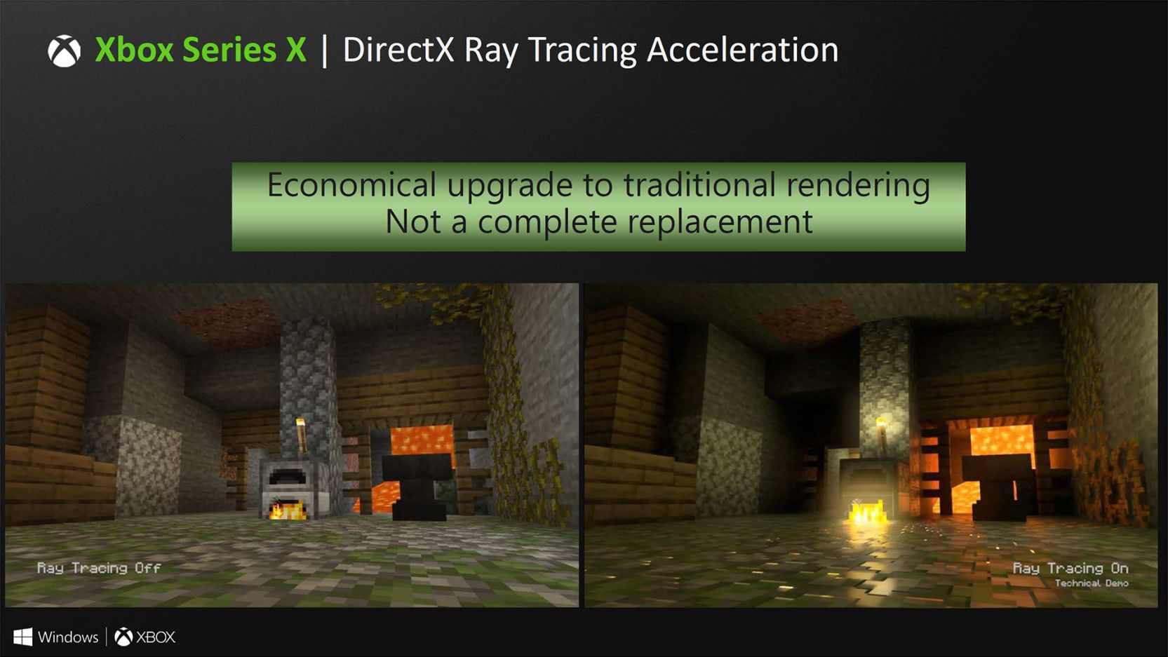 Главной «фишкой» архитектуры AMD RDNA 2 являются выделенные блоки для трассировки лучей с незамысловатым названием Ray Accelerators. Они выполняют четыре текстурных операции или четыре операции с трассировкой лучей за такт. К сожалению, Microsoft не предоставила данных, позволяющих напрямую сравнить быстродействие Xbox Series X и видеокарт Nvidia GeForce RTX 2000 в трассировке лучей.