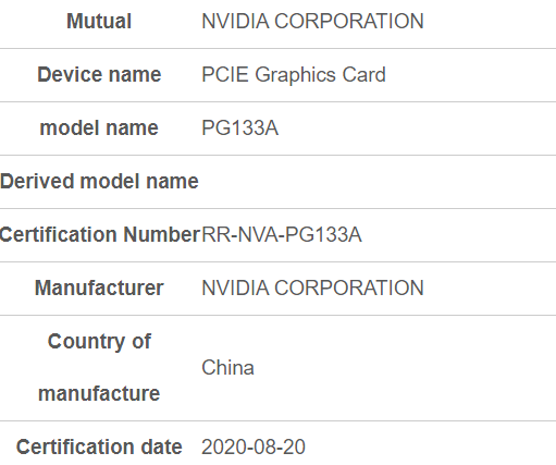 Подготовка к релизу видеокарт GeForce RTX 3000 набирает обороты. Новые 3D-ускорители Nvidia уже прошли сертификацию южнокорейским агентством RRA (National Radio Research Agency). Сегодня в его онлайн-базу была добавлена запись, посвящённая видеокарте с идентификатором PG133A.
