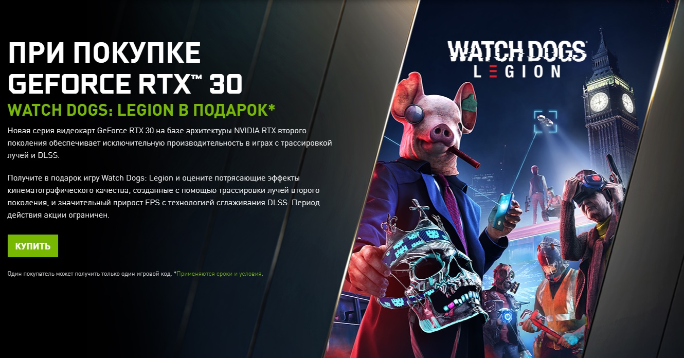 «Получите в подарок игру Watch Dogs: Legion и оцените потрясающие эффекты кинематографического качества, созданные с помощью трассировки лучей второго поколения, и значительный прирост FPS с технологией сглаживания DLSS», — говорится на сайте Nvidia.