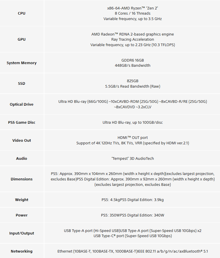 Спецификации приставки PS5