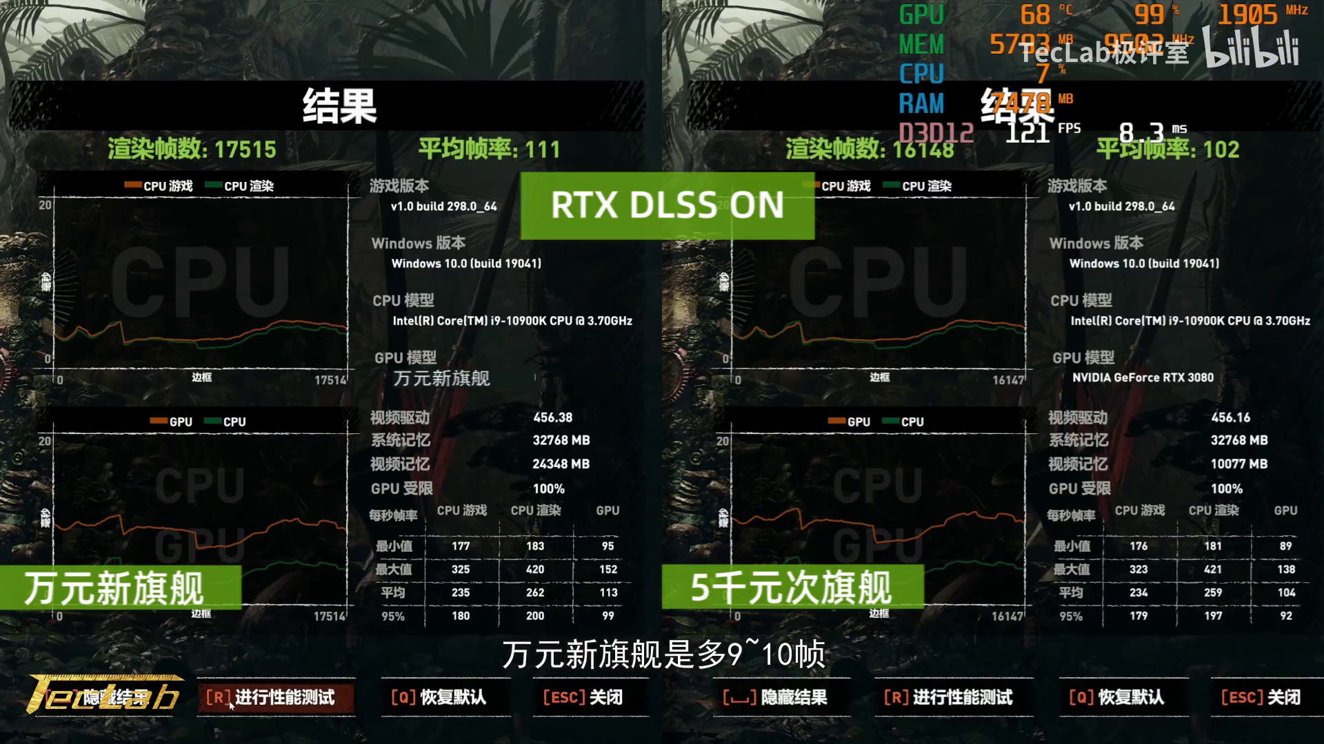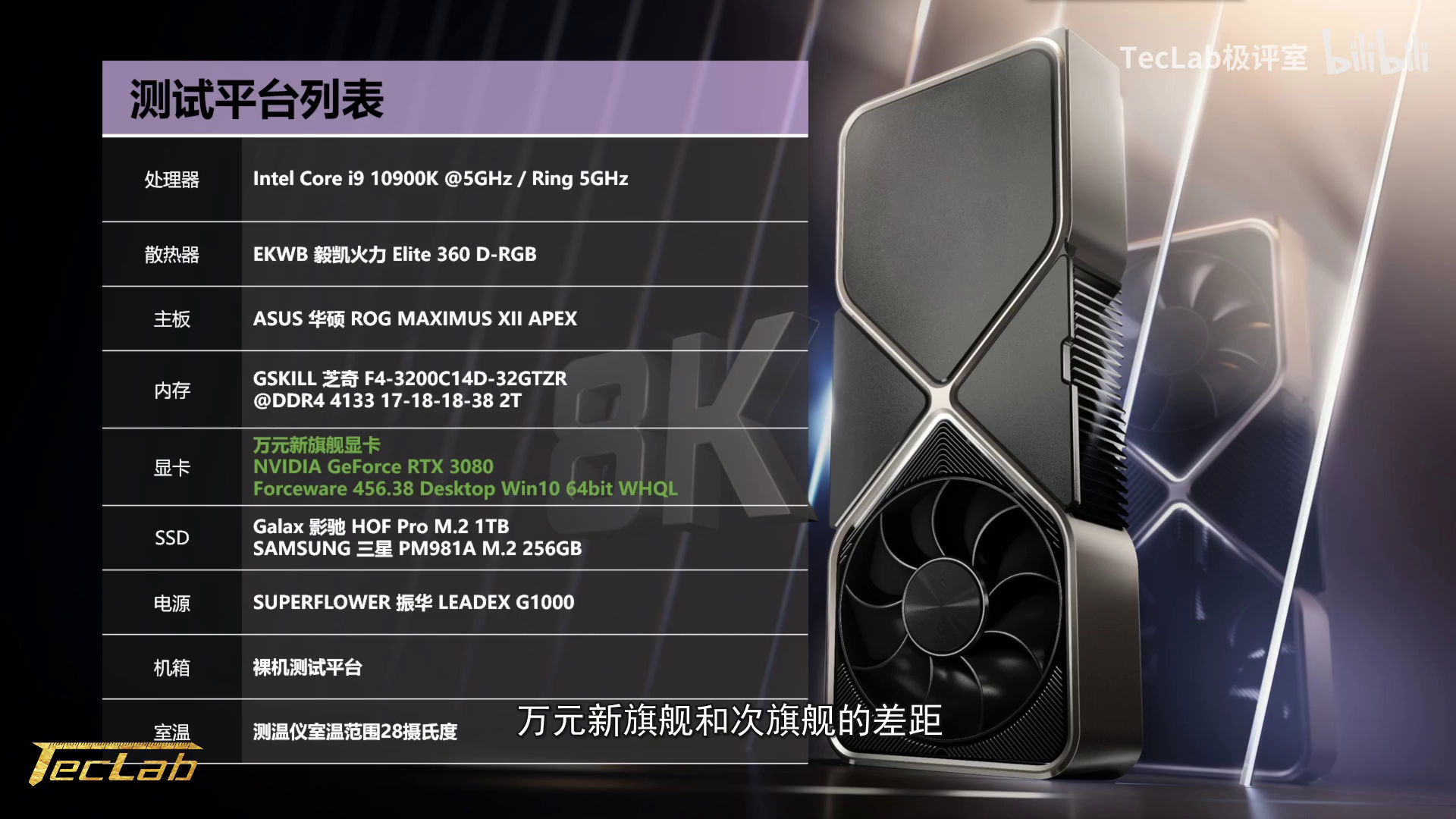 Тесты проводились на стандартной системе TecLab, которая включает разогнанный центральный процессор Intel Core i9-10900K в паре с памятью DDR4-4133. Несколькими днями ранее они протестировали GeForce RTX 3080 на этом же ПК и сравнили результаты. В видеоролике они называют карты «флагман за 10 тысяч юаней» и «флагман за 5 тысяч юаней».