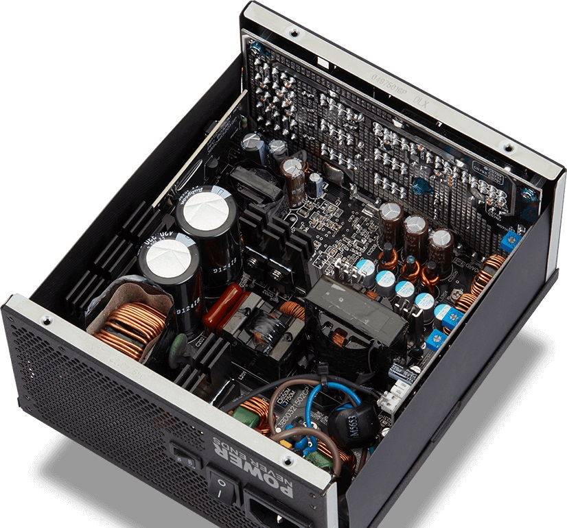 В источниках питания Hydro PTM Pro вендор использовал топологию LLC Full Bridge с преобразователем DC–DC, благодаря чему достигается высокая стабильность напряжений: ±1% при любой нагрузке. Активное охлаждение «внутренностей» обеспечивает 135-мм вентилятор на гидродинамическом подшипнике. С помощью кнопки на торце активируется Eco-режим, в котором «вертушка» начинается работать только при 30%-ной нагрузке БП.